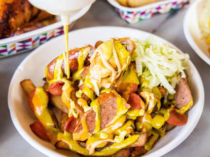 This spring, the folks behind La Mar , the popular (albeit slightly touristy) Peruvian seafood spot on the Embarcadero, opened a more casual and upbeat restaurant along a bustling stretch of Steiner Street. The tables around a dramatic olive tree basking in the spotlight of the atrium's glass ceiling, as well as the ones in the colorful heated parklet, are already full of local in-the-know diners enjoying low-ABV cocktails and authentic Peruvian food. The menu is all about slow-roasted rotisserie chicken cooked over a charcoal grill, complemented by traditional dishes, like fresh and vibrant cebiches, classic and comforting empanadas, and "okay, I'm just going to have one more" Dungeness crab croquettes.